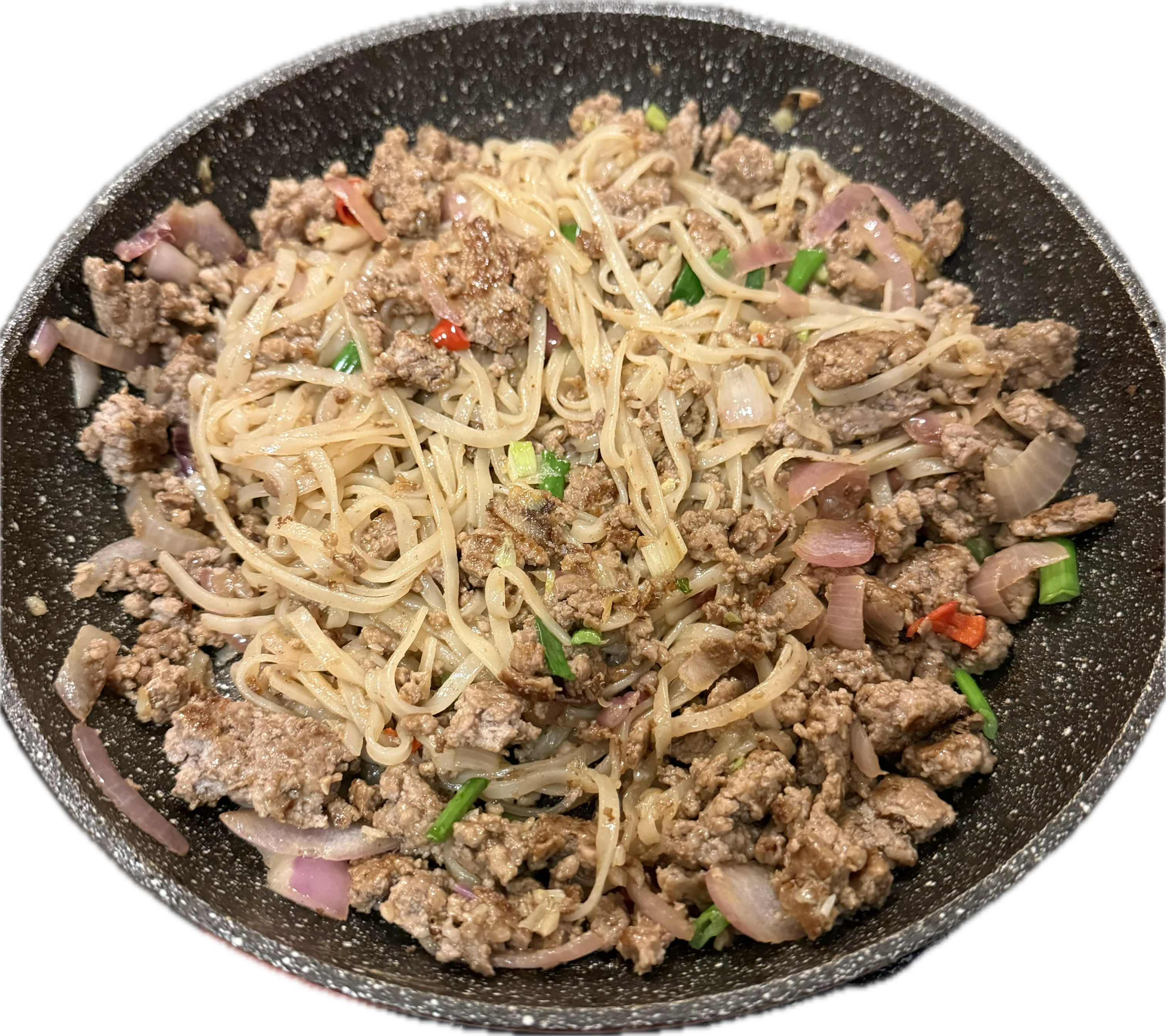 250g ground beef rice noodle (presoak for 30 min) green onion 3 red thai chilies half purple onion 3 cloves garlic chopped Eggs